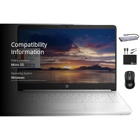 Thông tin sản phẩm HP 2024 Premium 14" Micro-Edge Portable Laptop Student Business, Intel Quad-Core N4120, 4GB RAM, 128GB (64GB eMMC+ 64GB Card), Webcam, WiFi, Windows 11S + 1 Year Office 365, MarxsolAccessory White