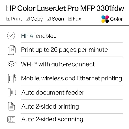 Thông tin sản phẩm HP Color LaserJet Pro MFP 3301fdw Wireless All-in-One Color Laser Printer, Office Printer, Scanner, Copier, Fax, ADF, Duplex, Best for office (499Q5F)