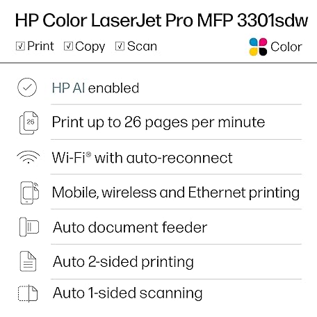 Thông tin sản phẩm HP Color LaserJet Pro MFP 3301sdw Wireless All-in-One Color Laser Printer, Office Printer, Scanner, Copier, ADF, Duplex, Best-for-Office (499Q3F)