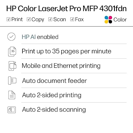 Thông tin sản phẩm HP Color LaserJet Pro MFP 4301fdn Printer, Print, Scan, Copy, Fax, Fast, Easy setup, Mobile printing, Advanced security, Best-for-small teams. Ethernet & USB only. Not Wireless. 16.6 x 17.1 x 15.1 in.