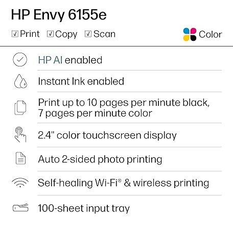Thông tin sản phẩm HP Envy 6155e Wireless All-in-One Color Inkjet Printer, Portobello, Print, scan, copy, Duplex printing Best-for-home, 3 month Instant Ink trial included, AI-enabled (714L5A)