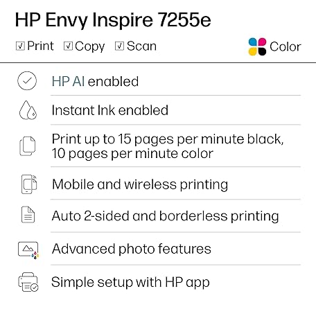 Thông tin sản phẩm HP Envy Inspire 7255e Wireless Color Inkjet Printer, Print, scan, copy, Easy setup, Mobile printing, Best-for-home, 3 month Instant Ink trial included, AI-enabled (1W2Y9A)