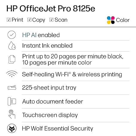 Thông tin sản phẩm HP OfficeJet Pro 8125e Wireless All-in-One Color Inkjet Printer, Print, scan, Copy, ADF, Duplex Printing Best-for-Home Office, 3 Month Instant Ink Trial Included, AI-Enabled (405T6A)