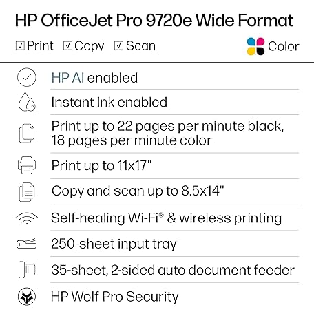 HP OfficeJet Pro 9720e Wide Format Wireless All-in-One Color Inkjet Printer, Print, scan, Copy, ADF, Duplex Printing Best-for-Office, 3 Months of Instant Ink Included, AI-Enabled (53N95A)