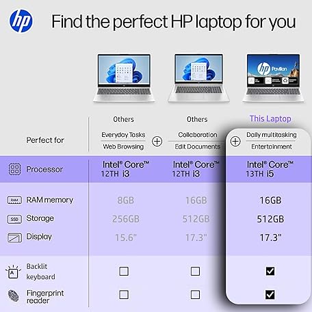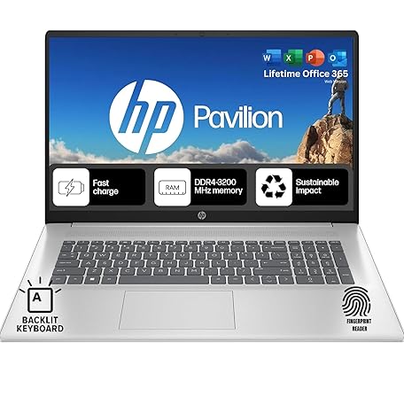 • HP Pavilion 17.3 Backlit Keyboard Laptop with Fingerprint Reader | Lifetime Office 365 for The Web | Intel 10-Core i5, Iris Xe Graphics | 16GB RAM, 512GB SSD Storage | Windows 11 w/o Mouse