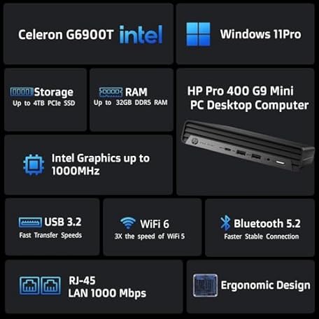Thông tin sản phẩm HP Pro 400 G9 Mini PC Desktop Computer, Intel CPU, 16GB DDR5 RAM, 256GB PCIe SSD, Triple 4K Display Support, USB-C, Ultra-Quiet Design, Bluetooth 5.2, WiFi 6, Keyboard and Mouse, Windows 11 Pro