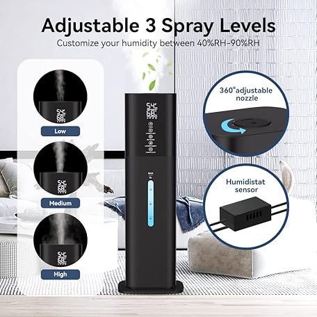 Thông tin sản phẩm Humidifiers Large Room Bedroom with 7 Colors Light, 2.1Gal(8L) 3 Speed Quiet Ultrasonic Cool Mist Humidifier with 360° Nozzle, Humidity Setting, Timer,Aroma Box for Home Plant Baby Yoga Sleep (Black)