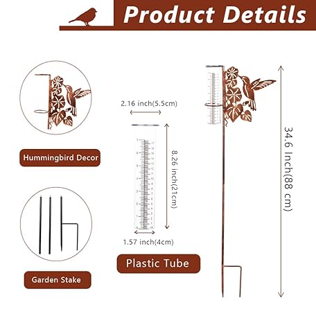 Thông tin sản phẩm Hummingbird Rain Gauge Outdoor, Freezeproof Rain Gauge with Plastic Measuring Tube Rain Water Gauge Decor for Lawn, Yard, Garden (35'' Tall)