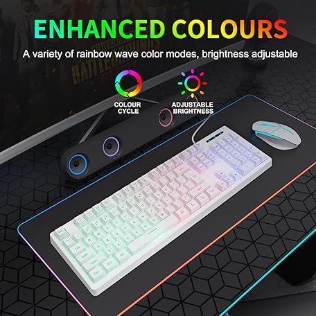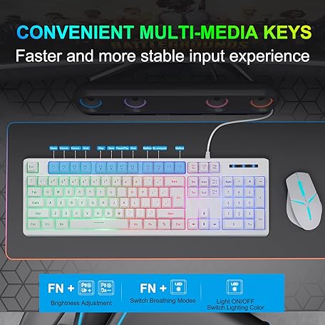 Thông tin sản phẩm HUO JI White Gaming Keyboard USB Wired with Rainbow LED Backlit, Floating Keys, Mechanical Feeling, Spill Resistant, Ergonomic for Xbox, PS Series, Desktop, Computer, PC