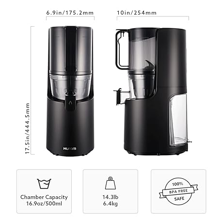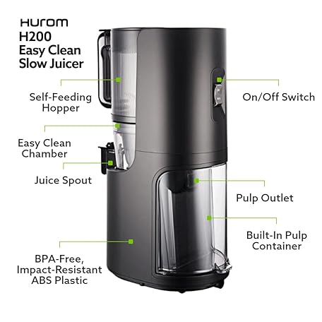 Thông tin sản phẩm Hurom H-200 Electronic Slow Juicer Machine (Silver) - Self Feeding w Big Mouth Hopper to Fit Whole Fruits & Vegetables - Healthy Living - Easy Rinse Clean No Scrub BPA Free Easy Assembly