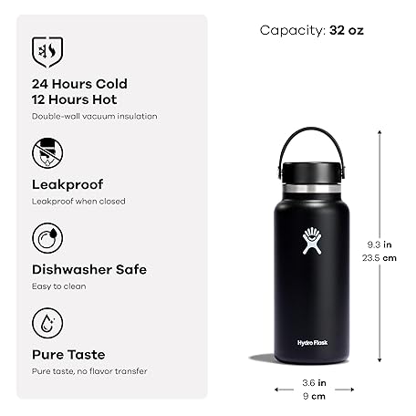 Sản phẩm Hydro Flask Water Bottle - Insulated Stainless Steel - Wide Mouth Flex Lid, Non Spill, Leakproof and Refillable in 32 Oz Black đang được bán với giá ưu đãi là $37.06 tại nước Mỹ.