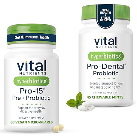 Hyperbiotics Vital Nutrients Gut & Oral Health Bundle – Pro-15 Digestive Prebiotics + Probiotics (60 Time Release Pearls) & Pro-Dental Oral Probiotics with BLIS K12 & M18 (45 Mint Tablets)