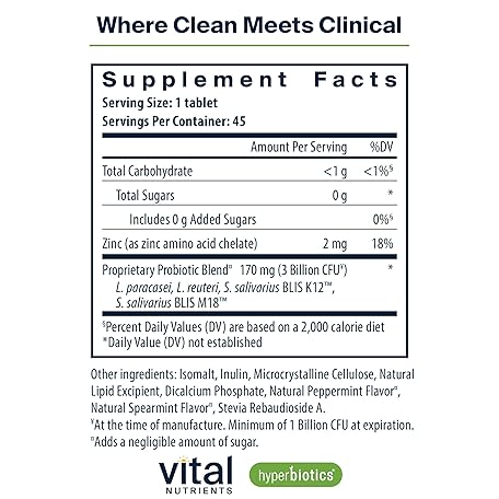Sản phẩm Hyperbiotics Vital Nutrients Pro Dental Probiotic | Clinically Studied BLIS K12 and M18 | Oral Probiotics for Bad Breath Treatment for Adults | Oral Health for Teeth and Gums | 45 Mint Tablets đang được bán với giá ưu đãi là $25.8221 tại nước Mỹ.