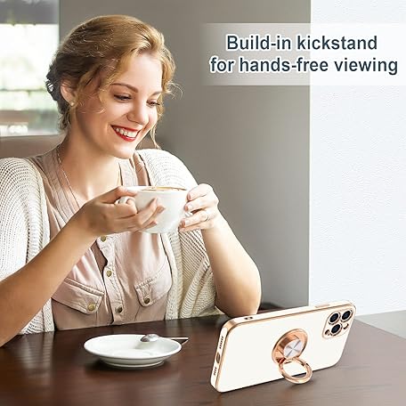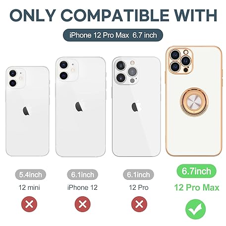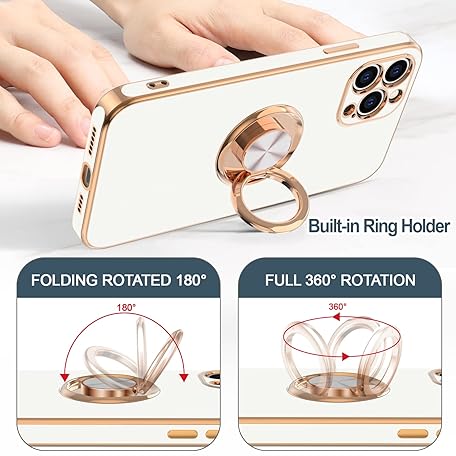 Hython Case for iPhone 12 Pro Max Case with Ring Stand [360° Rotatable Ring Holder Magnetic Kickstand] [Soft Microfiber Lining] Plating Rose Gold Edge Shockproof Protective Phone Cases Cover, White