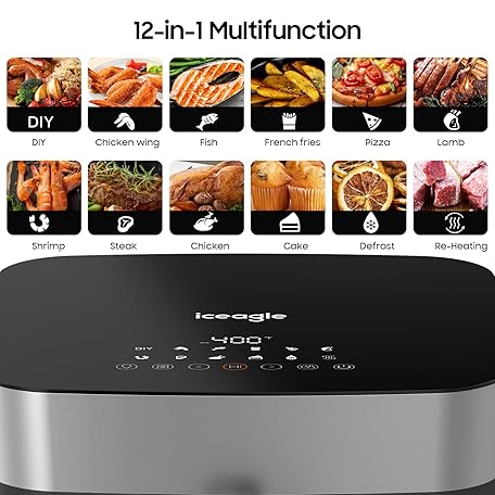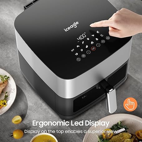 Iceagle Stainless Steel Air Fryer 9 Quart - Airfryer XXL with Large Viewing Window, Dual Heating Elements, 12-in-1 Function to Roast, Bake, Broil, Defrost, Reheat, Dishwasher-Safe Parts, 1700W, Siver