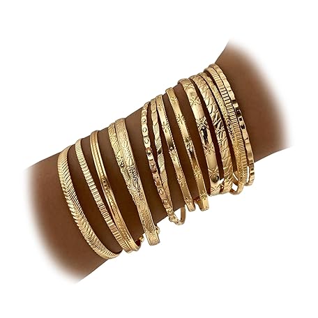 IFKM Gold Bangles Bracelets For Women, 14k Gold Plated Multi Layer Stackable Open Bracelet Set, Elegance Trendy Charms Non Tarnish Minimalist Textured Boho Jewelry Gift for Women