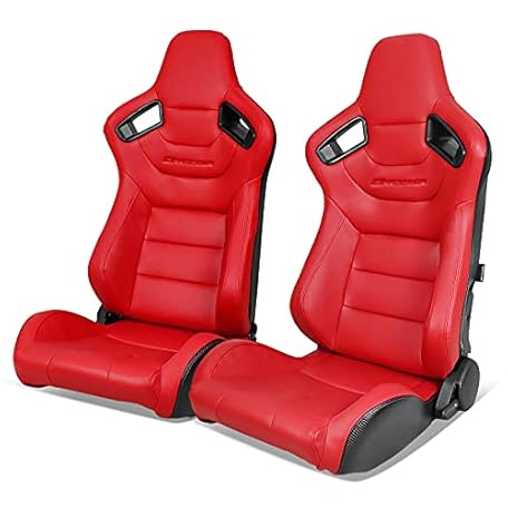 IKON MOTORSPORTS, Universal Racing Seats Pair with Dual Sliders, Red PU & Carbon Leather Reclinable Left Right