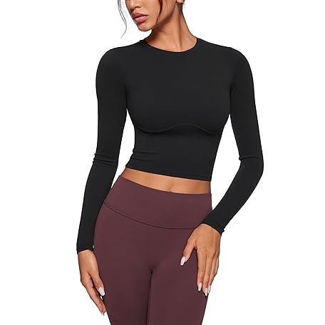 INGIA Womens Long Sleeve High Round Neck Crop Yoga Shirts Workout Slim Fit Casual Yoga Gym Tops