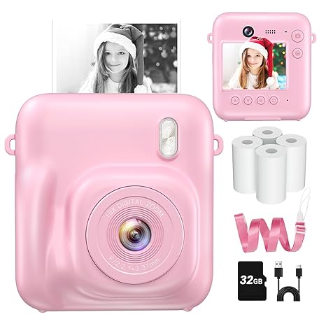 Instant Camera, Dual-Lens Kids Camera Instant Print for Boys Girls Christmas Birthday Gifts, 1080P Digital Cameras for Kids Teens with Print Paper, 32GB Card, Toddle Toy for Age 4-12 Years(Pink)