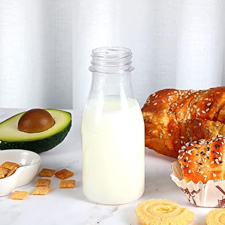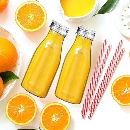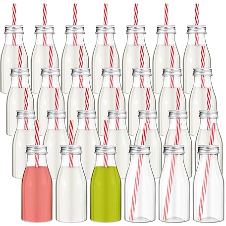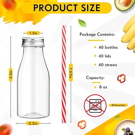 Irenare 40 Sets Plastic Small Milk Bottles with Straws and Metal Lids Clear Plastic Bottle for Dairy Milk Party Bottle for Milk Juices Shakes Smoothies, 40 Bottles and 40 Straws (Silver,8 oz)