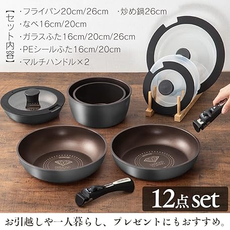 Thông tin sản phẩm Iris Ohyama H-IS-SE12 Frying Pan Pot Set, Gas Fire, Induction Compatible, 12 Pieces, Diamond Coated, Removable Handle, Lightweight, Non-Stick, Easy Care