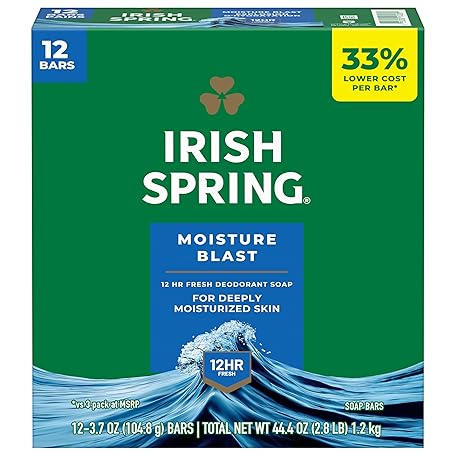 Sản phẩm Irish Spring Moisture Blast Deodorant Bar Soap for Men, 12 Hour Fresh Deodorant Soap, 3.7 oz Bar (12 Pack) đang được bán với giá ưu đãi là $8.6873 tại nước Mỹ.