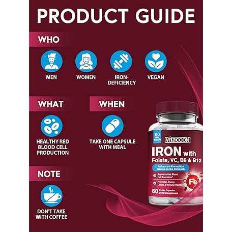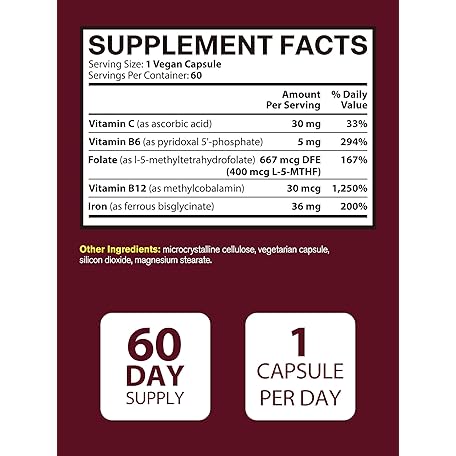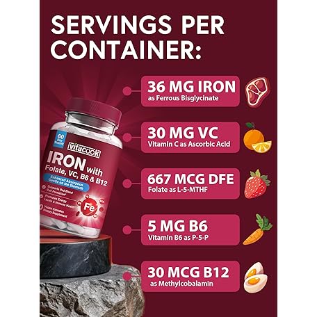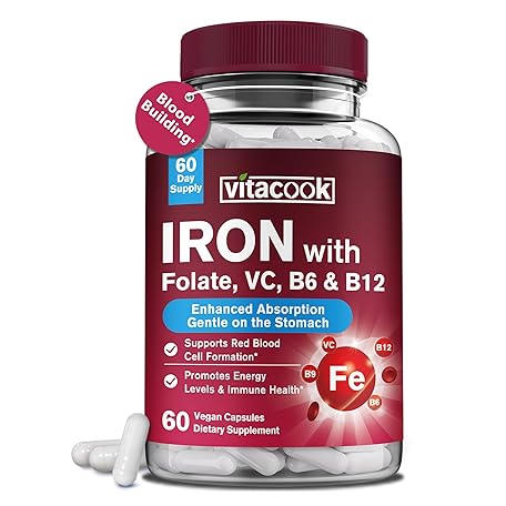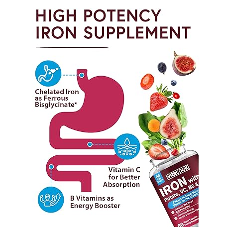 Iron Supplement for Women & Men, Iron Bisglycinate with Vitamin C, B6, B12, Folate, Stomach Friendly, Non-Constipating, Blood Health & Energy Boost, 60 Vegan Caps