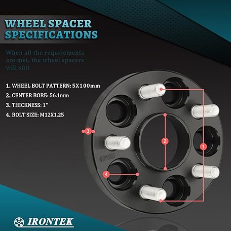 Thông tin sản phẩm IRONTEK 1" 5x100mm to 5x100mm Wheel Spacers (25mmThickness, 56.1mm Hub Bore, 12x1.25 Studs) Hubcentric Spacers for Subaru Impreza/Crosstrek/Outback/Legacy, for Saab 9-2x 4PCS