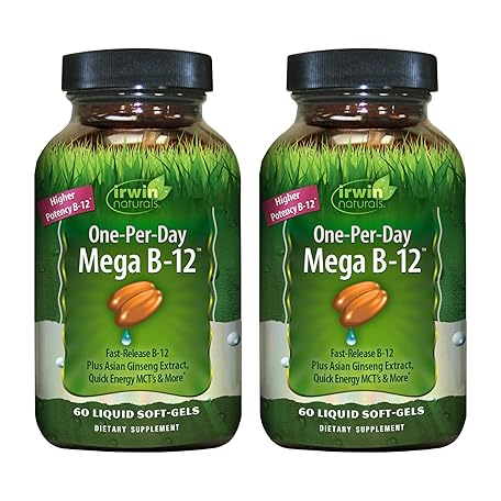 Thông tin sản phẩm Irwin Naturals One-Per-Day Mega B-12 1,500mcg High Potency Methylcobalamin Vitamin - Fast Enhanced Absorption with MCT + Asian Ginseng - Natural Energy Boost - 60 Liquid Softgels (Pack of 2)