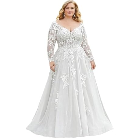 • Isafabufy Plus Size Wedding Dress for Bride with Long Sleeve V Neck Lace Appliques Long Bridal Gowns for Women