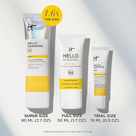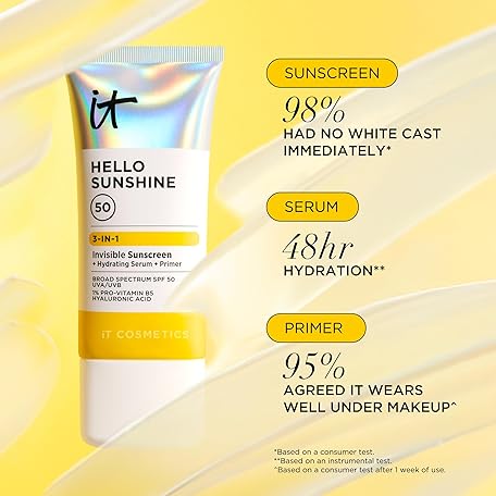 Thương hiệu It Cosmetics là cái tên nổi tiếng được rất nhiều khách hàng trên thế giới chọn lựa. Với kiểu dáng đẹp mắt, sang trọng, sản phẩm IT Cosmetics Hello Sunshine Invisible Sunscreen for Face SPF 50 - Sunscreen, Hydrating Serum & Makeup Primer - 1% Pro-Vitamin B5 & Hyaluronic Acid - HSA/FSA Eligible - No White Cast là sự lựa chọn hoàn hảo nếu bạn đang tìm mua một món cho riêng mình.
