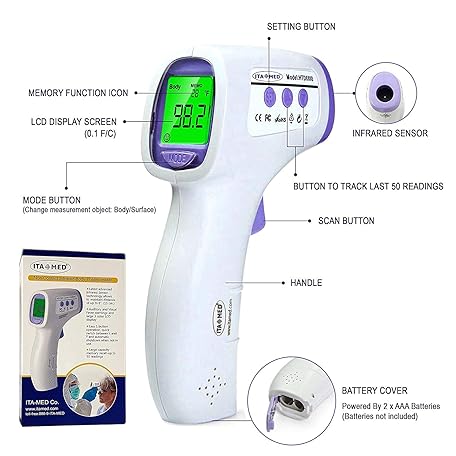 Thông tin sản phẩm ITA-MED Digital Non-Contact Infrared Forehead Thermometer for Adults & Kids, Accurate Instant Reading, Dual Mode Body & Surface ?C / ?F, Intelligent Temperature/Fever Alert, Batteries Included