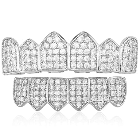 Iuoden Iced Out Diamond Teeth Grillz for Men Women, Hip Hop Silver Gold Grills for your teeth Top and Bottom, Rapper Costume Mouth Grillz with Silicone Molding Bars