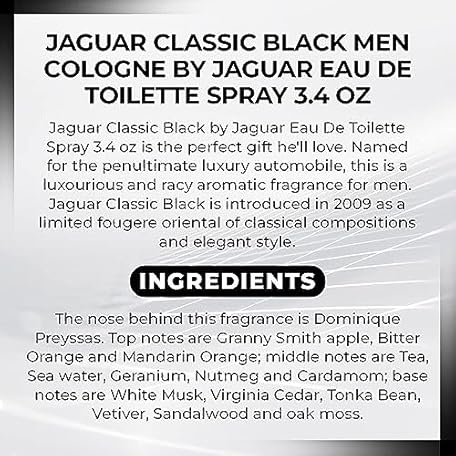 Thương hiệu JAGUAR là cái tên nổi tiếng được rất nhiều khách hàng trên thế giới chọn lựa. Với kiểu dáng đẹp mắt, sang trọng, sản phẩm JAGUAR Classic Black men cologne by Jaguar Eau De Toilette Spray 3.4 oz là sự lựa chọn hoàn hảo nếu bạn đang tìm mua một món cho riêng mình.