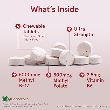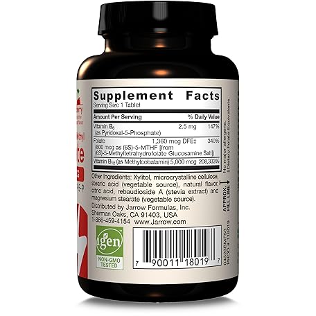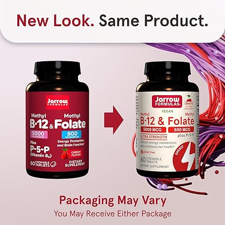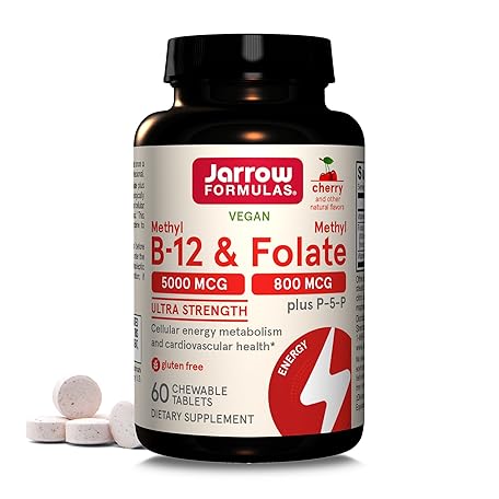Thông tin sản phẩm Jarrow Formulas Ultra Strength Methyl B-12 5000 mcg & Methyl Folate 800 mcg + P-5-P, Dietary Supplement for Cellular Energy Metabolism and Cardiovascular Support, 60 Chewable Tablets, 60 Day Supply