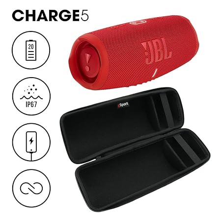 • JBL Charge 5 Waterproof Portable Speaker with Built in Powerbank and gSport Carbon Fiber Case (Red)