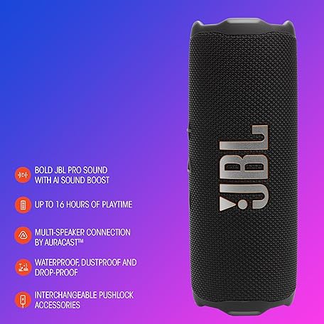 JBL Flip 7 - Portable Waterproof and Drop-Proof Speaker, Bold Pro Sound with AI Sound Boost, 16Hrs of Playtime, and PushLock System with Interchangeable Accessories (Black)