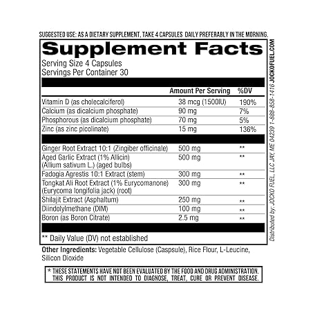 Thông tin sản phẩm Jocko Fuel Test Booster for Men - Natural Endurance, Stamina, & Strength Booster - Muscle Builder for Men & Nitric Oxide Support with Ginger Root, Shilajit, & Tongkat Ali, 120ct (30 Servings)