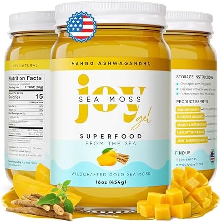 Joy Sea Moss Wildcrafted Irish Sea Moss Gel 16 oz | Made in USA | Gold Seamoss Superfood | Rich in Vitamins & Minerals | Real Fruit | Nutritional Supplement | Mango Ashwagandha