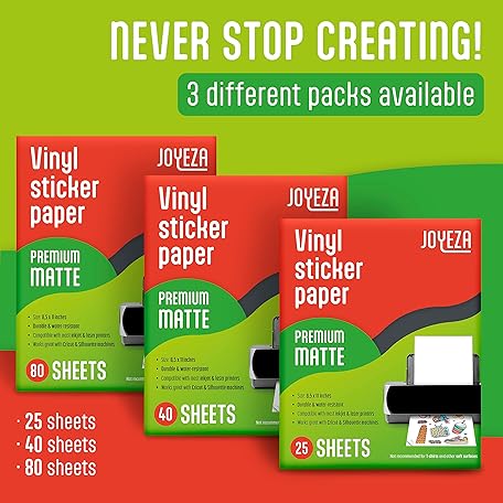 Thông tin sản phẩm JOYEZA Premium Printable Vinyl Sticker Paper for Inkjet Printer - 25 Sheets Matte White Waterproof, Dries Quickly Vivid Colors, Holds Ink well- Tear Resistant - Inkjet & Laser Printer
