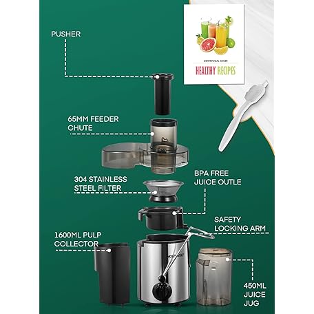 Thông tin sản phẩm Juicer Machine, HOUSNAT Centrifugal Juicer,Extractor Max Power 800W Juice, 65MM Chute for Whole Fruit and Vegetables, Juice Extractor with 3 Speeds Quick Juicing, Easy to Clean, BPA Free,Silver
