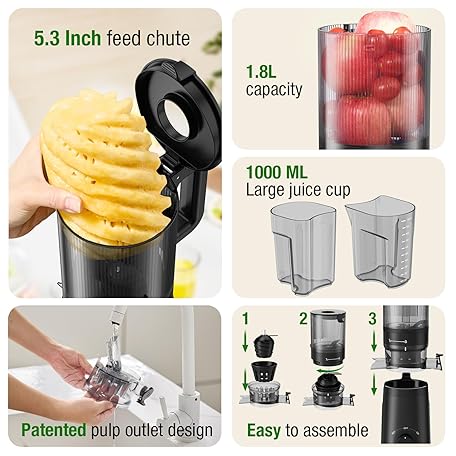Thông tin sản phẩm Juicer Machines, TUUMIIST Cold Press Juicer with 5.3" Extra Large Feed Chute Fit Whole Fruits & Vegetables Easy to Clean, High Juice Yield, BPA Free (Black)