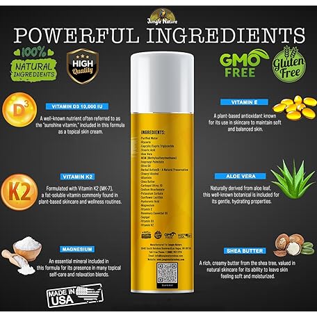 Thông tin sản phẩm Jungle Nature - Vitamin D3 10,000 IU with K2 Cream (3.4oz) – High-Potency, Fast-Absorbing Formula – Enriched with Magnesium, Vitamin E, MSM, Non-Greasy & Paraben-Free.