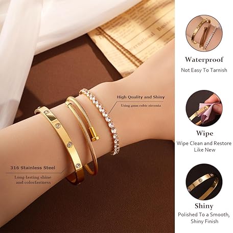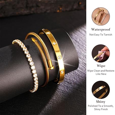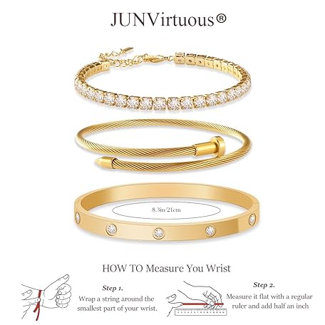 Thông tin sản phẩm JUNVirtuous 3-Pack Gold Bracelets for Women,18K Gold Plated Bangle Tennis Bracelets Stack Set for Women Trendy Non Tarnish Stainless Steel Gold Bangles Accessories Designer Jewelry Pulseras Para Mujer