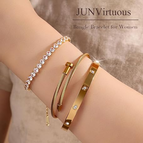 Thương hiệu JUNVirtuous là cái tên nổi tiếng được rất nhiều khách hàng trên thế giới chọn lựa. Với kiểu dáng đẹp mắt, sang trọng, sản phẩm JUNVirtuous 3-Pack Gold Bracelets for Women,18K Gold Plated Bangle Tennis Bracelets Stack Set for Women Trendy Non Tarnish Stainless Steel Gold Bangles Accessories Designer Jewelry Pulseras Para Mujer là sự lựa chọn hoàn hảo nếu bạn đang tìm mua một món cho riêng mình.