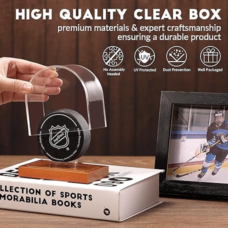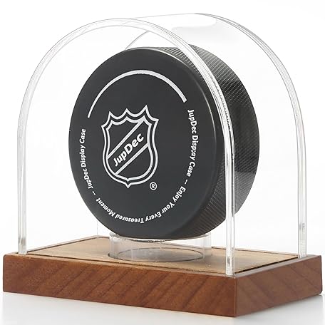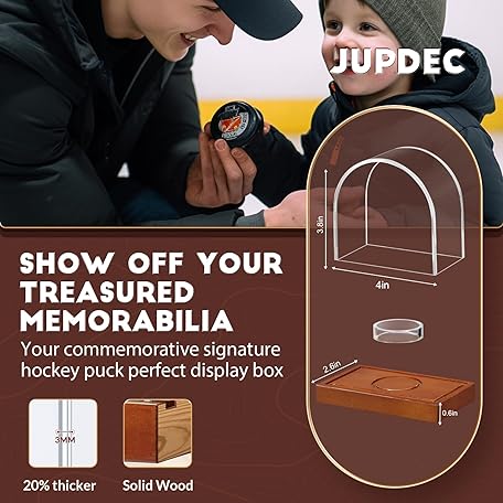 JupDec Hockey Puck and Collectibles Display Case, Premium Acrylic Clear Box Puck Holder with Mahogany Wood Base, Showcase for Autographed Souvenir Memorabilia, Collectible Figure Stand