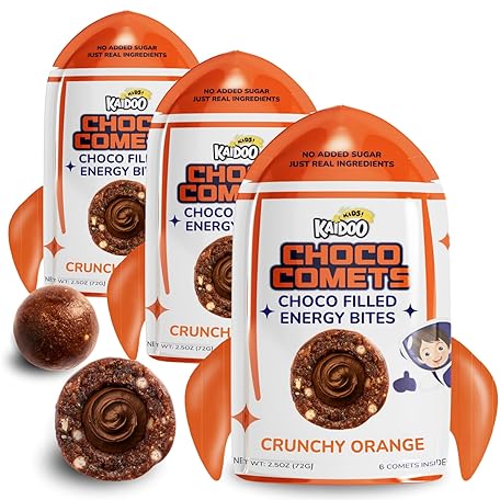 Kaidoo Kids Choco Comets – Crunchy Orange Flavor 3 Pack, Chocolate Filled Energy Balls, Natural High Protein & Fiber Dye Free, No Added Sugar, 7+ Activities, Healthy Snacks for Children