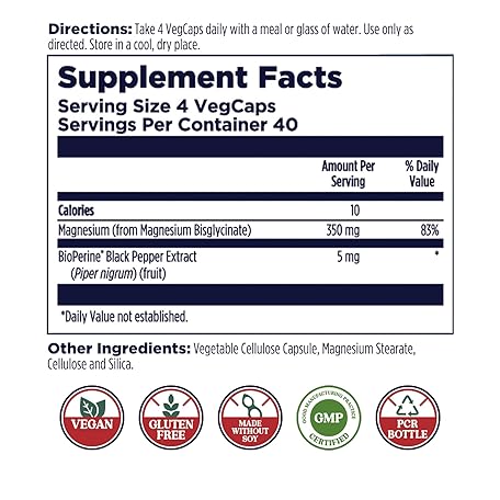 Thông tin sản phẩm KAL Magnesium Glycinate Capsules, Fully Chelated Magnesium Bisglycinate, High Absorption Magnesium Supplement, Healthy Bones, Muscle, Relaxation and Stress Support, Non-GMO 160 count
