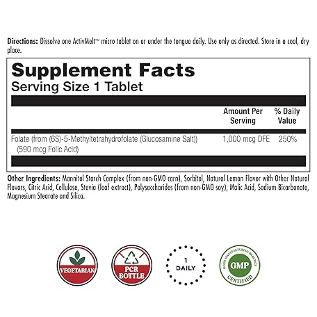 Thông tin sản phẩm KAL Methyl Folate 1000 mcg, 5-MTHF Active Form, Folic Acid Supplement, Heart Health, Prenatal, Mood and Brain Support, Vegetarian, Natural Lemon ActivMelt, 60-Day Guarantee, 60 Serv, 60 Micro Tablets