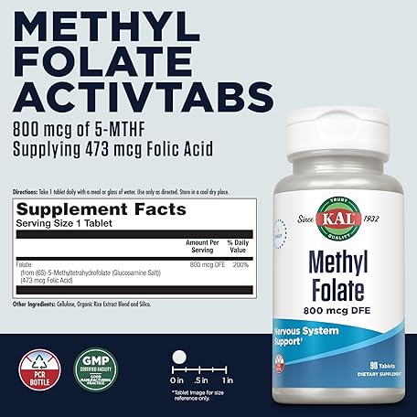 Thông tin sản phẩm KAL Methyl Folate 800 mcg DFE, 5-MTHF Active Form Vitamin B9, Folic Acid Supplement, Heart Health, Prenatal, Mood and Brain Support, Fast Dissolving ActivTab, 60-Day Guarantee, 90 Servings, 90 Tablets